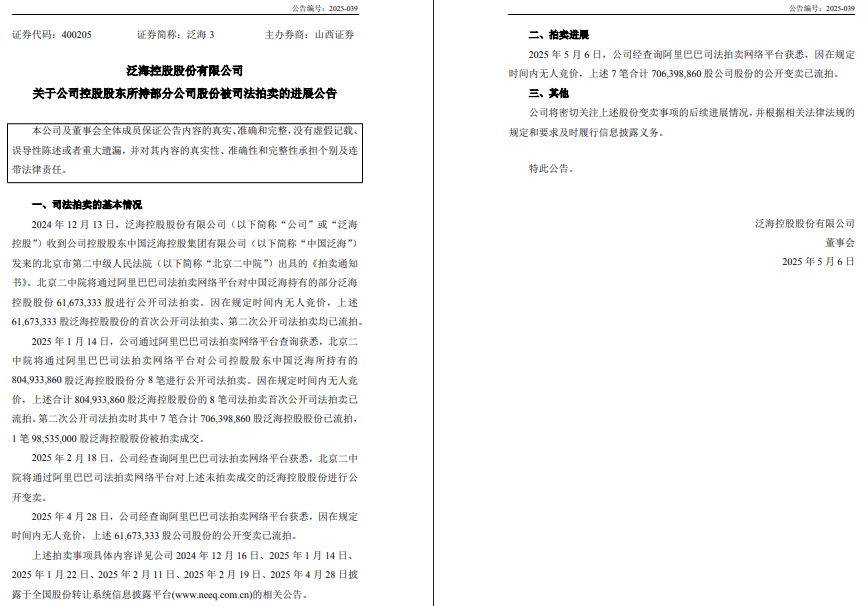 来历:泛海控股股份无限公司关于公司控股股东所持部门公司股份被司法拍卖的进展通知布告(通知布告编号:2025-039)