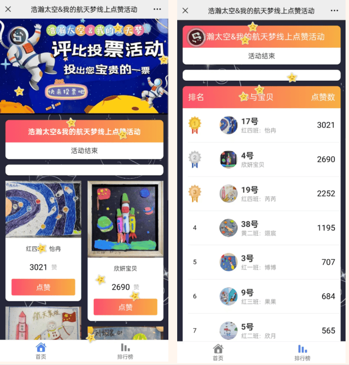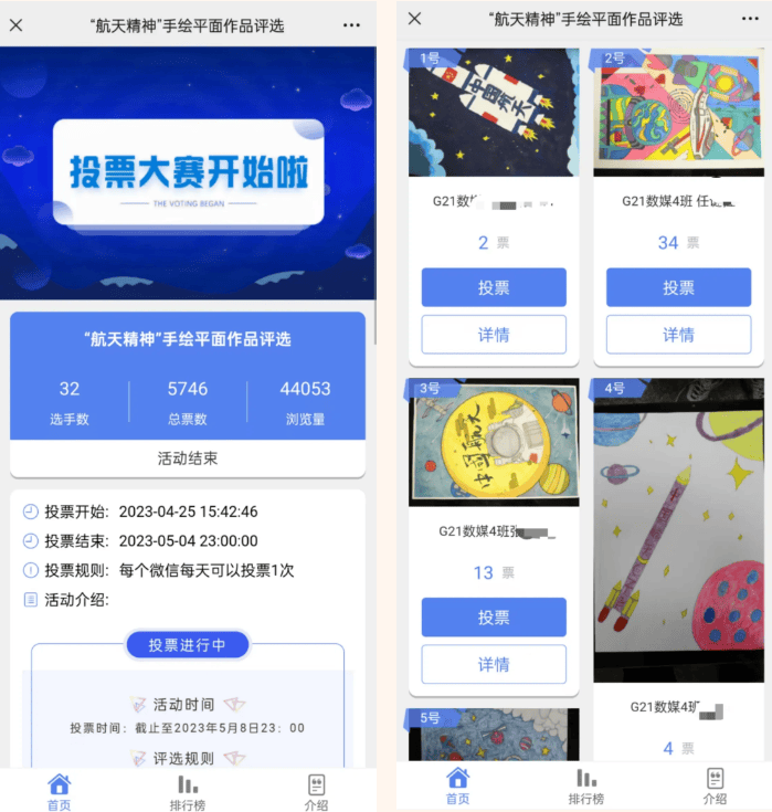 让参赛者制做航天模子,将参赛选手或做品相关材料添加到勾当中,来向公共普及航天学问,还能激发公共的脱手能力。让选手正在创做时、参取者正在投票时,通过绘画的体例展现和宣传航天,让为本人喜好的选手投票点赞。再由公共评选出最受欢送的优良模子,航天,设置投票起头和竣事的时间,并予以表扬。
